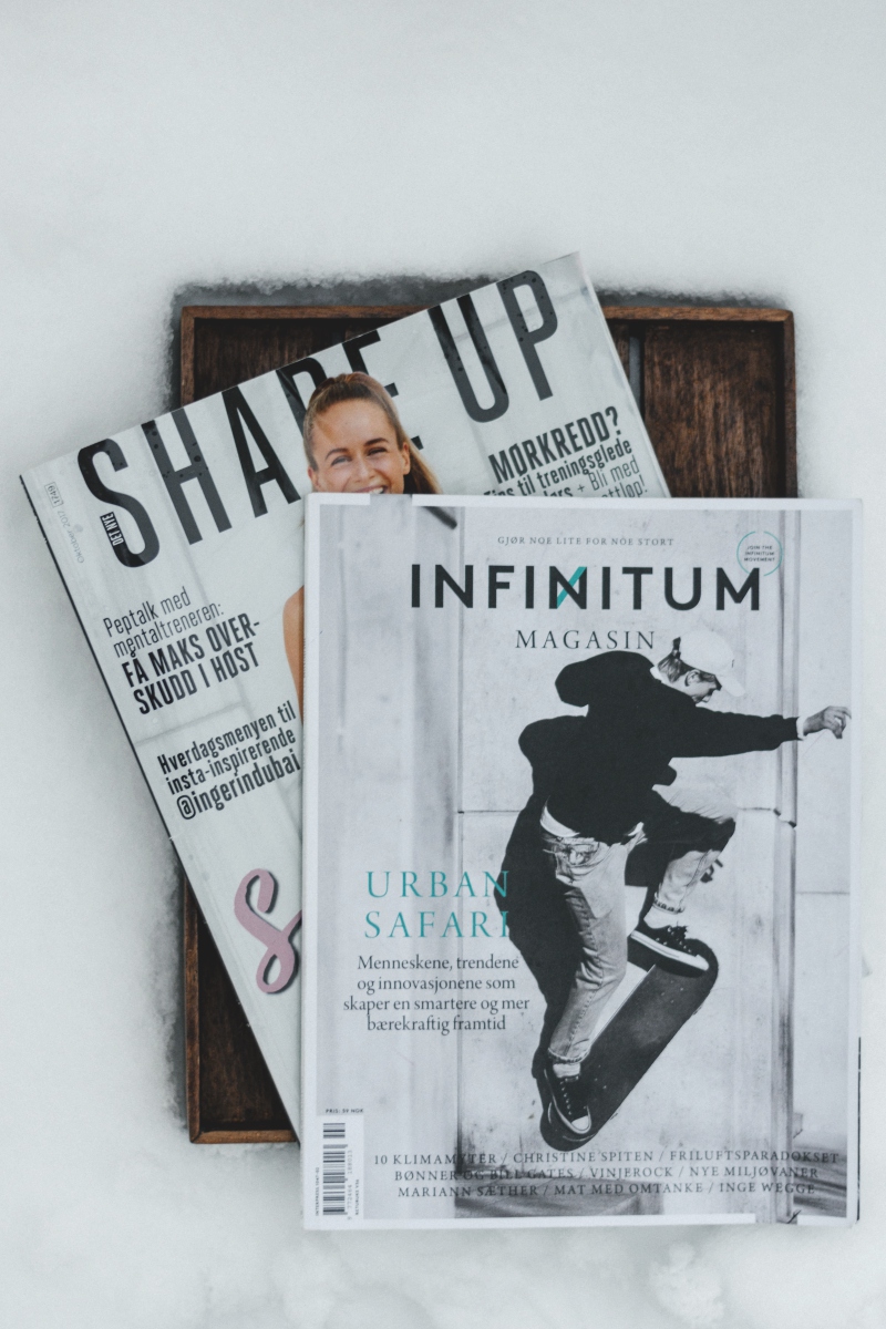 Magazynów nie kupuję dużo, praktycznie w ogóle. W Norwegii są one drogie, a do tego, odzwyczaiłam się od gromadzenia gazet w domu. Śmiało można je zastąpić czytaniem artykułów na norweskich stronach internetowych, o których więcej pisałam tutaj. Jednak czasami po nie sięgam, a moim ulubionym jest zdecydowanie magazyn INFINITUM. Bardzo ciekawe artykuły i rozmowy, a wszystko kręci się wokół środowiska oraz dbania o jego kondycje. Brak komercyjnych reklam, które najczęściej stanowią połowę magazynu, fajne ilustracje, dobrej jakości papier. Słownictwo nie jest trudne, a jeśli interesujesz się środowiskiem i bardziej świadomym życiem, ta gazeta jest dla Ciebie. Jeśli nie chcesz kupować magazynu, zajrzyj na ich stronę internetową, gdzie znajdziesz również mnóstwo artykułów.