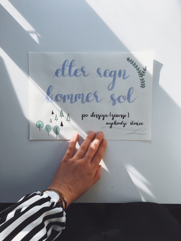 Niekoniecznie kończyło się na pisaniu tekstów, bo do tego potrzebuję wypoczętej głowy. Jednak zmęczonemu i zestresowanemu ciału super robił brush lettering, który co jakiś czas w maju też się u mnie przewijał. Do gustu szczególnie przypadło mi pisanie wartościowych cytatów i zwrotów po norwesku, dzięki czemu, dużo łatwiej je zapamiętać. Ostatnio brakowało mi czasu na tę nową pasję, ale na pewno będę do niej wracała. Podoba się Wam? Muszę tylko zamówić sobie nowe flamastry, bo te szybko zniszczyły się przez pisanie na gorszej jakości papierze. Taka przestroga dla osób, które też interesuje brush lettering. Lepiej zainwestować w lepszej jakości papier, by przedłużyć żywotność brush penów, które do najtańszych przecież nie należą. A ja nigdy nie miałam zdolności plastycznych, więc to zajęcie uczy mnie cierpliwości i walki z perfekcjonizmem. W myśl mojej ulubionej zasady… lepsze zrobione od doskonałego!