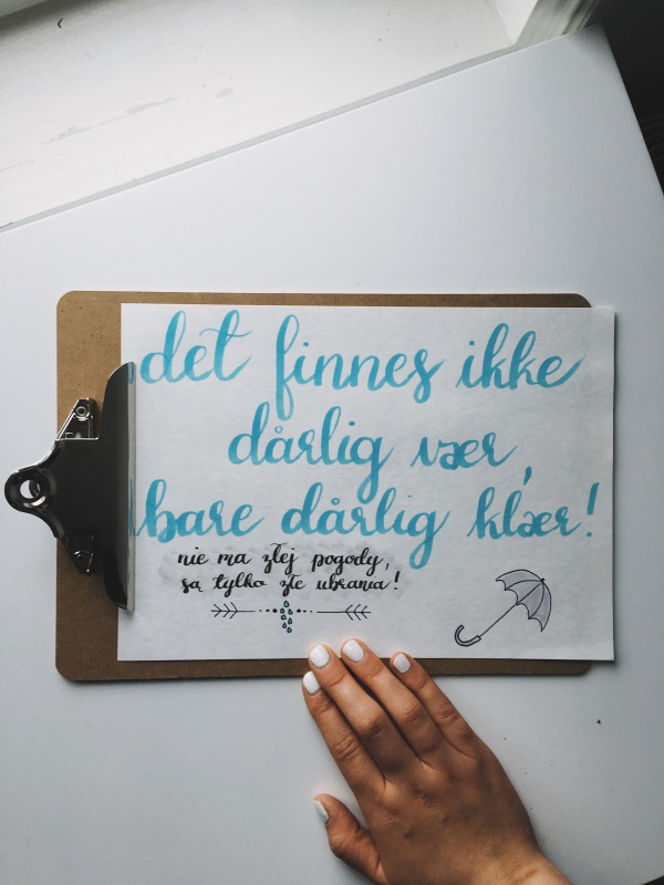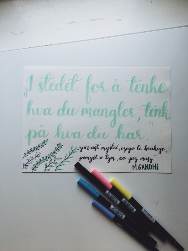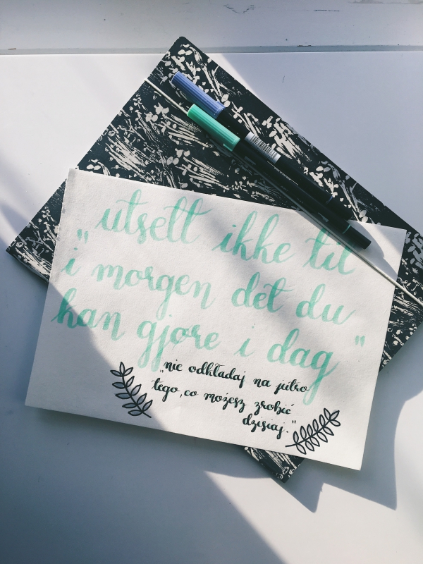 Niekoniecznie kończyło się na pisaniu tekstów, bo do tego potrzebuję wypoczętej głowy. Jednak zmęczonemu i zestresowanemu ciału super robił brush lettering, który co jakiś czas w maju też się u mnie przewijał. Do gustu szczególnie przypadło mi pisanie wartościowych cytatów i zwrotów po norwesku, dzięki czemu, dużo łatwiej je zapamiętać. Ostatnio brakowało mi czasu na tę nową pasję, ale na pewno będę do niej wracała. Podoba się Wam? Muszę tylko zamówić sobie nowe flamastry, bo te szybko zniszczyły się przez pisanie na gorszej jakości papierze. Taka przestroga dla osób, które też interesuje brush lettering. Lepiej zainwestować w lepszej jakości papier, by przedłużyć żywotność brush penów, które do najtańszych przecież nie należą. A ja nigdy nie miałam zdolności plastycznych, więc to zajęcie uczy mnie cierpliwości i walki z perfekcjonizmem. W myśl mojej ulubionej zasady… lepsze zrobione od doskonałego!