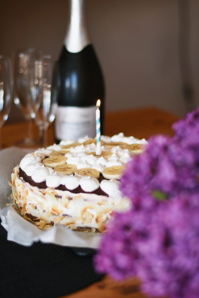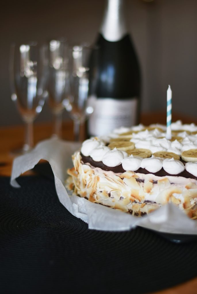 Na koniec czekają Cię same przyjemności. Na pojedynczy biszkopt połóż połowę masy, a następnie całość wyłóż jeszcze plastrami banana o średniej grubości. Na to kładziemy kolejny biszkopt i czynność powtarzamy. Ozdobienie góry tortu zależy już od Ciebie, ja użyłam do tego bitej śmietany, którą przygotowałam na początku, plasterków banana i prażonych płatków kokosowych, którymi obsypałam tort dookoła.