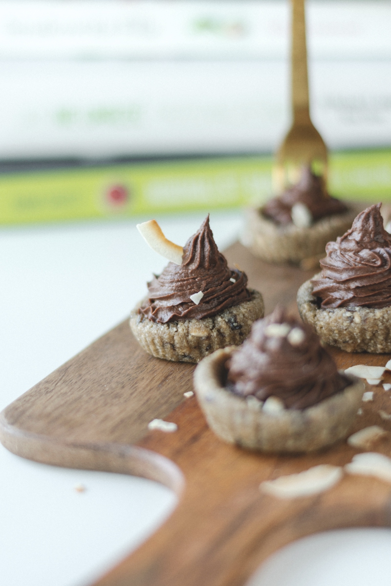 Do wyłożenia babeczek masą wykorzystałam rękaw cukierniczy i jedną z końcówek, które pomogły mi uzyskać piękny efekt widoczny na zdjęciach. Gotowe babeczki należy odstawić na kilka godzin do lodówki, czekoladowy krem stężeje, a smaki jeszcze bardziej się połączą. Kremu wyszło mi więcej, niż spodu, dlatego przygotowałam jeszcze dwa słoiczki wypełnione tym czekoladowym cudem. Można po prostu przygotować więcej masy na spód, np. 1,5 porcji i zrobić dodatkowe babeczki albo wykorzystać go jako smarowidło na domowy chlebek, do owsianki itp.