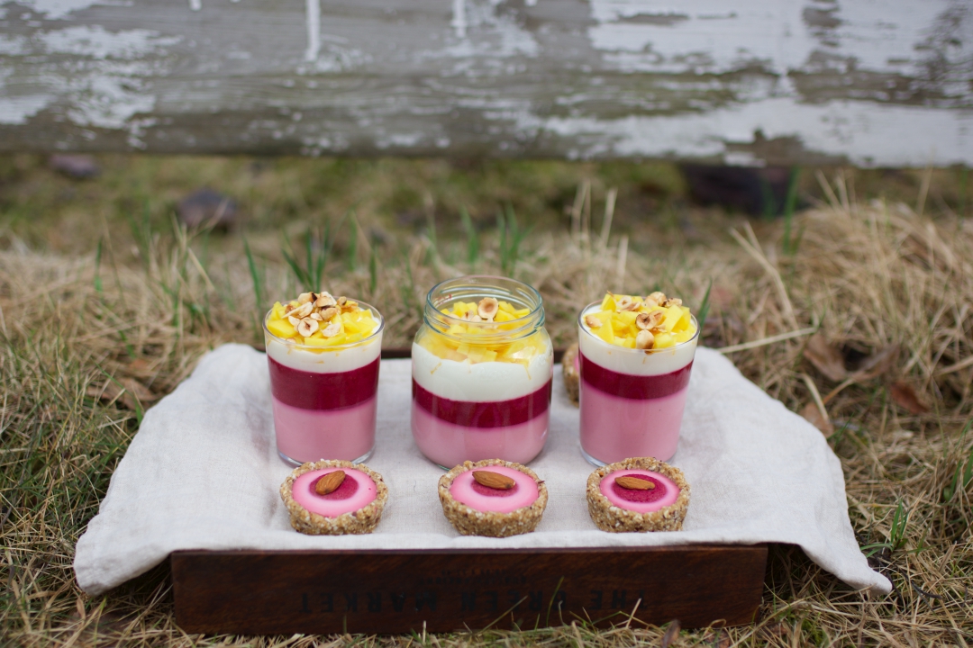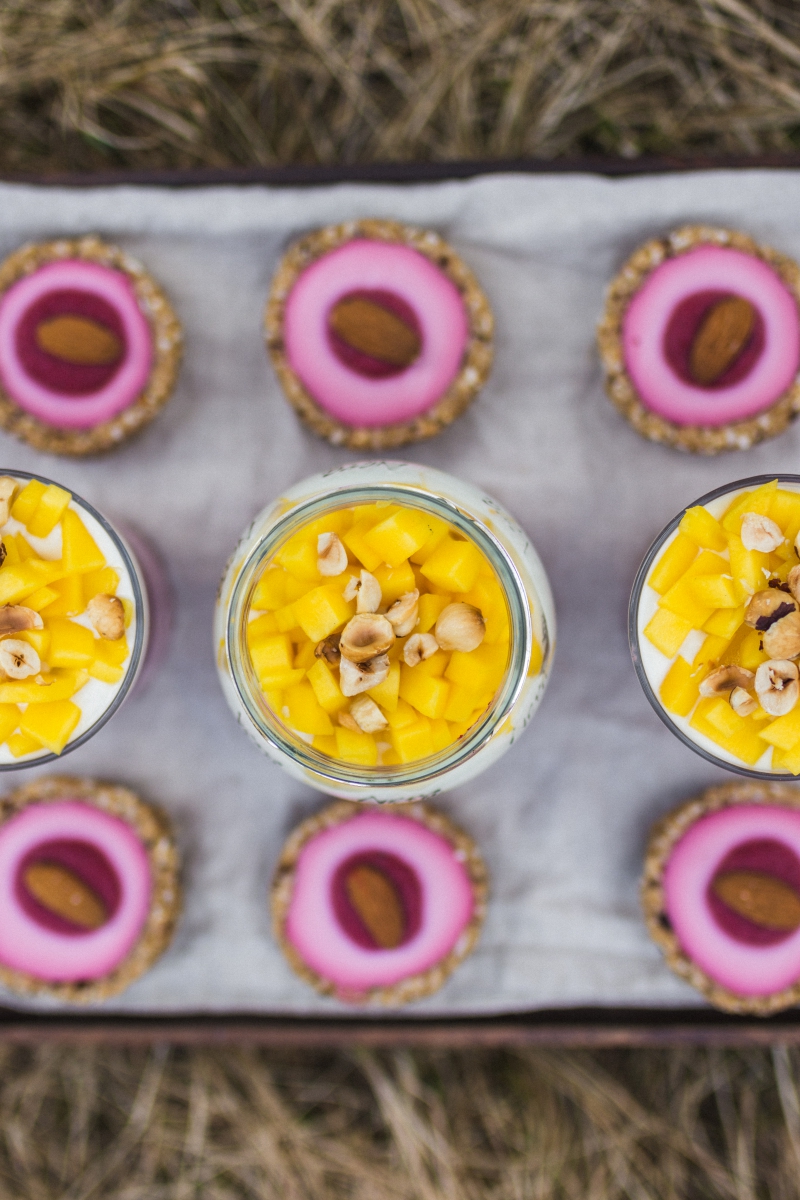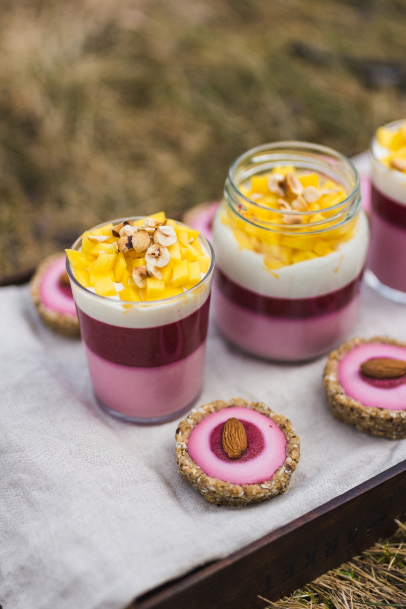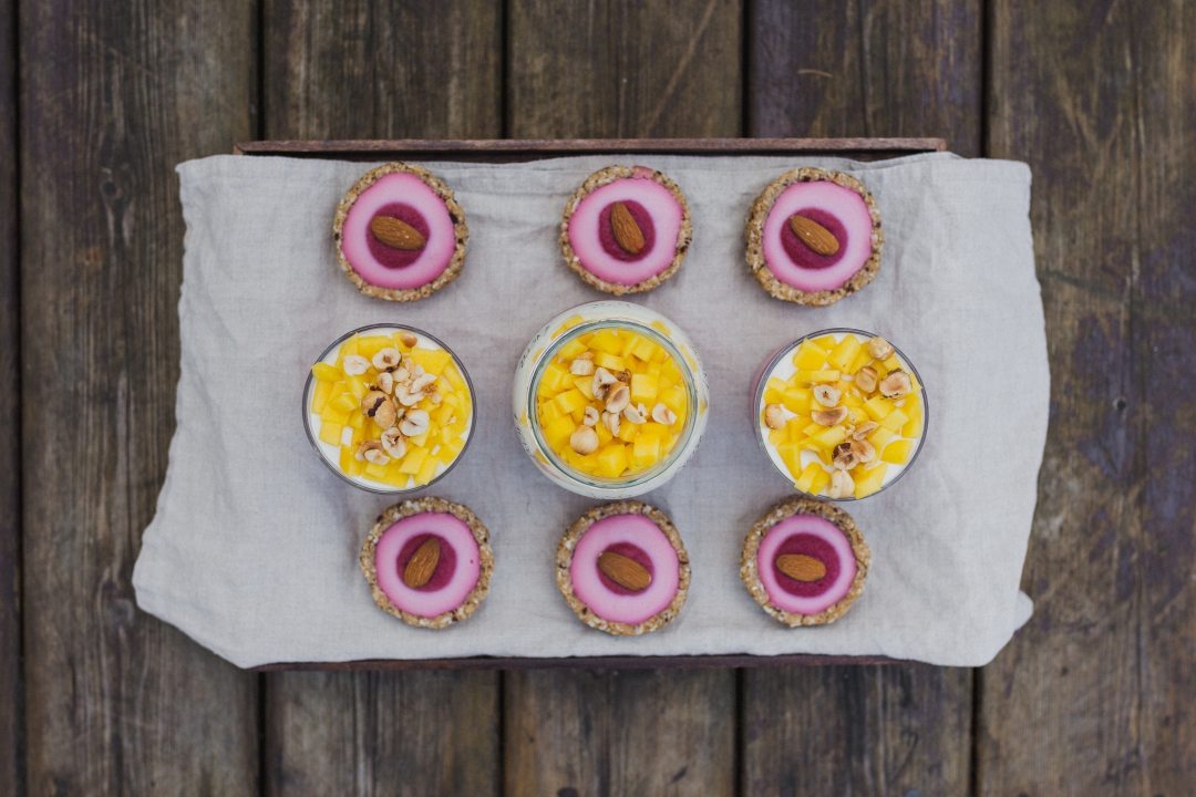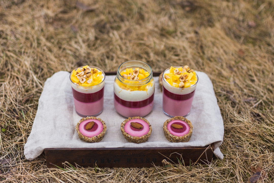 Gotowym sosem z wiśni ozdobić serniczki, resztę przelać do szklaneczek. Tarteletki ozdobiłam dodatkowo migdałami, a deser w szklankach uzupełniłam warstwą naturalnego jogurtu sojowego, świeżym mango i orzechami.